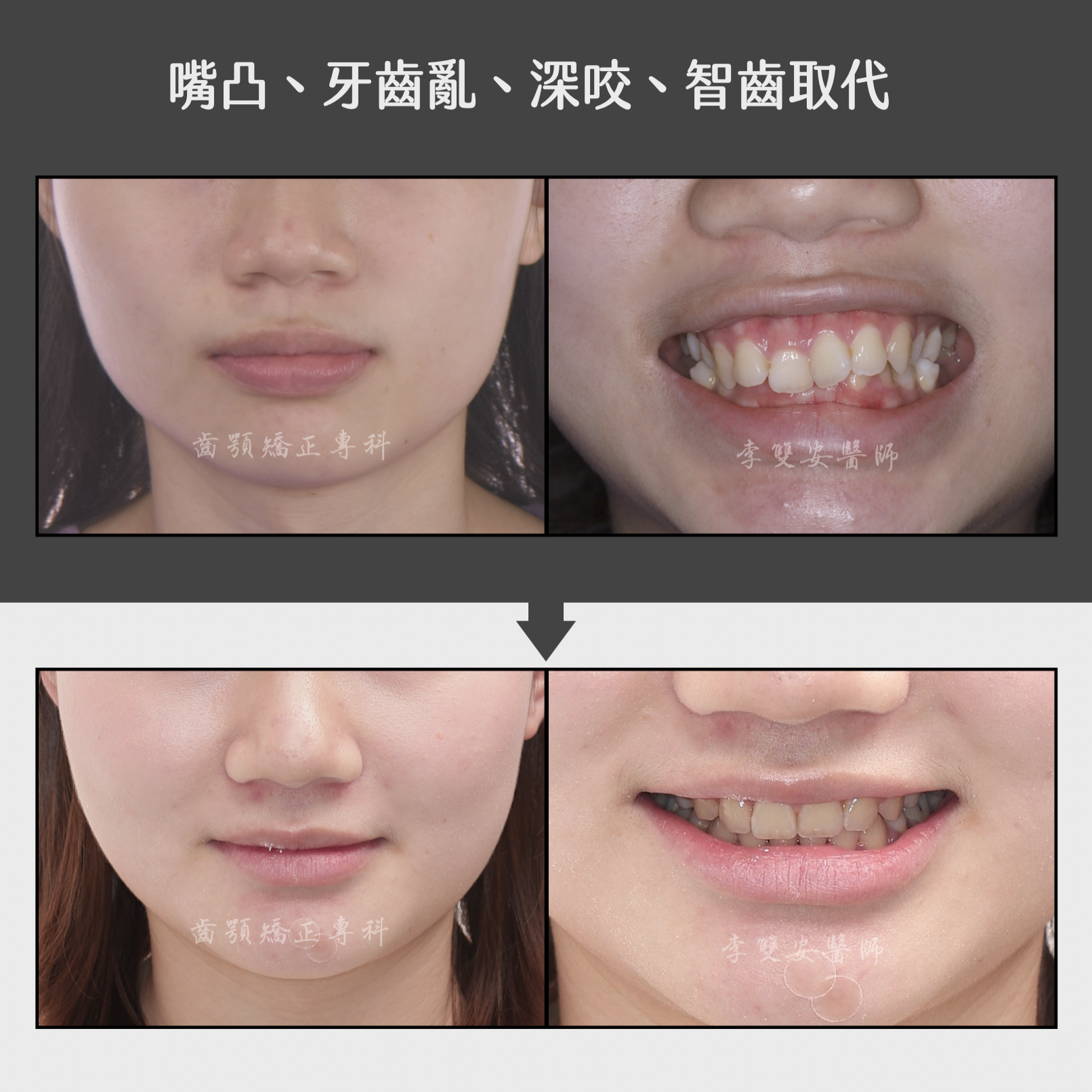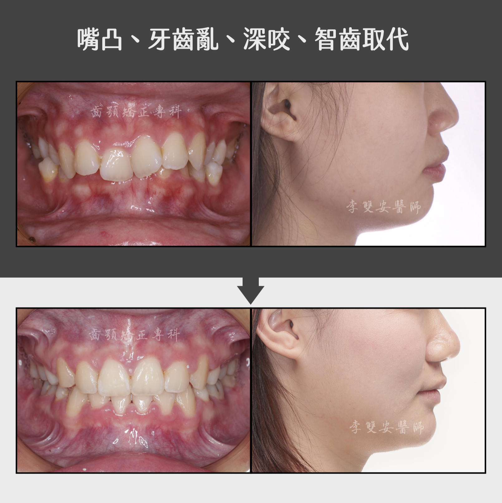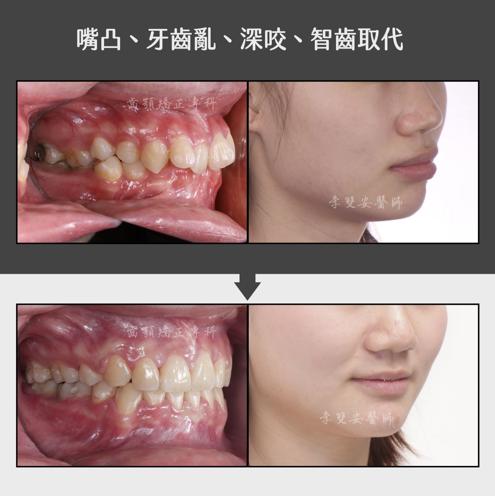 治療完成後,成果非常令人滿意。患者原本嚴重凌亂的牙齒排列整齊了,深咬與嘴凸問題也徹底改善,側臉線條變得更加柔和自然。
