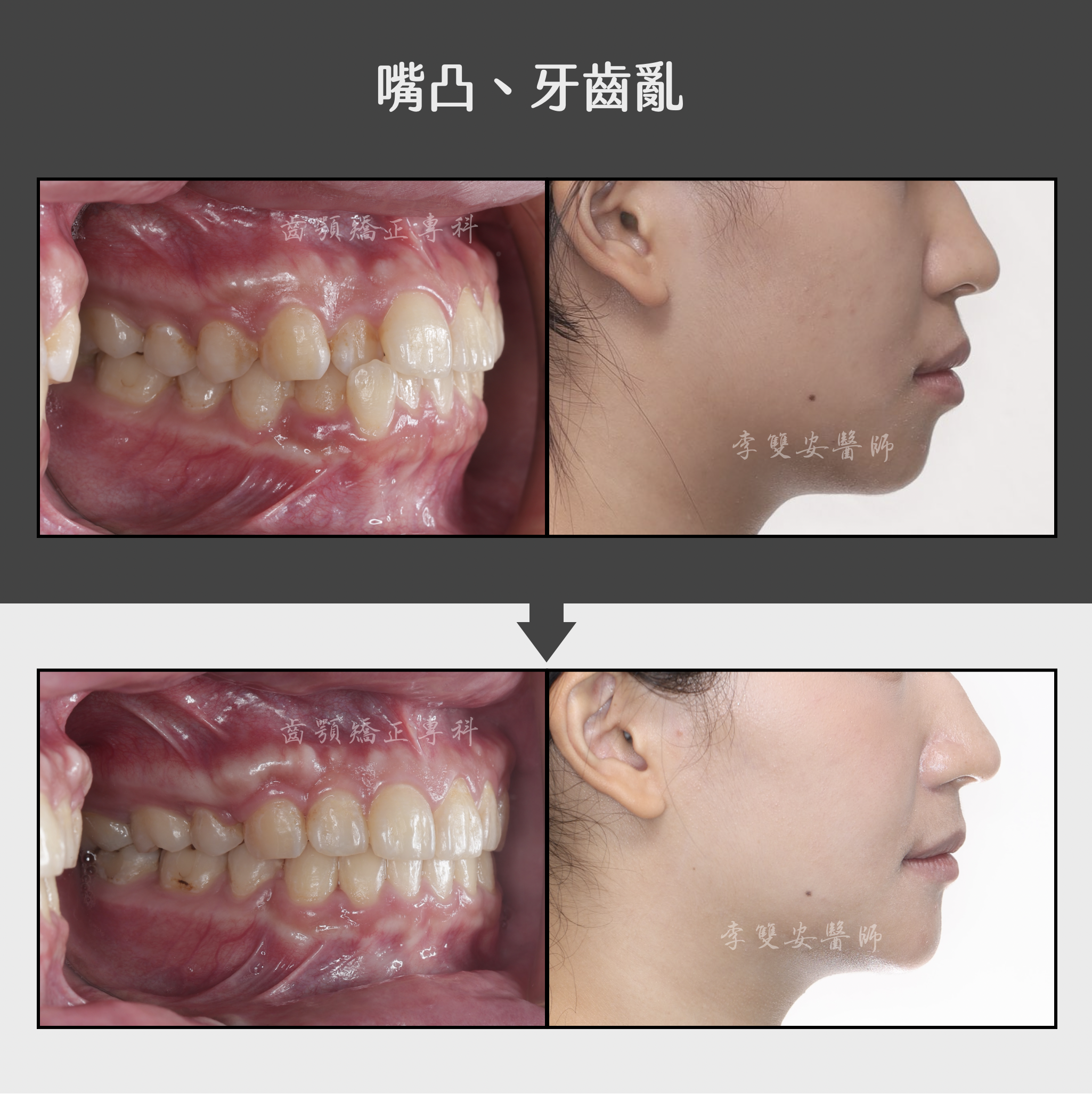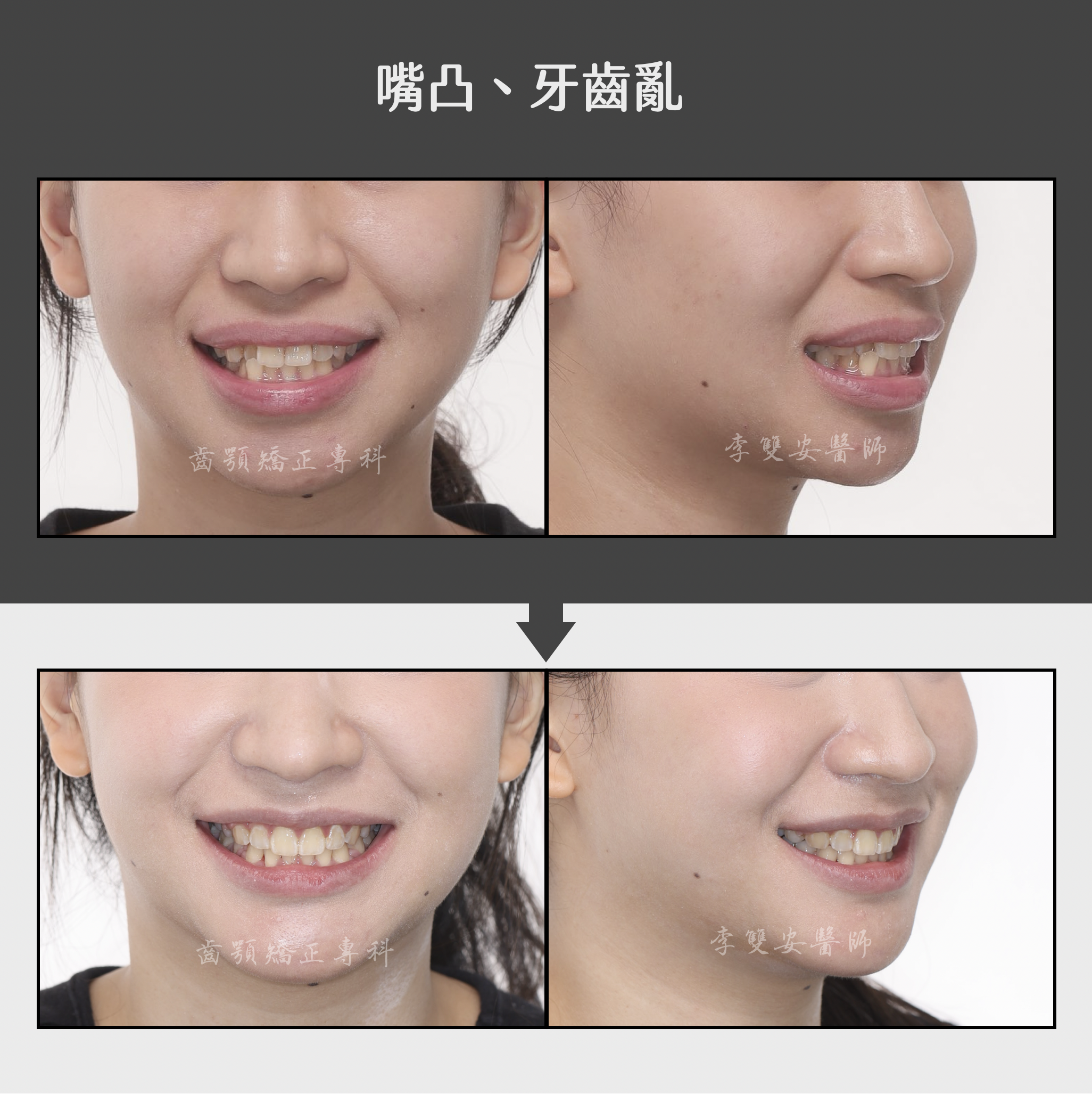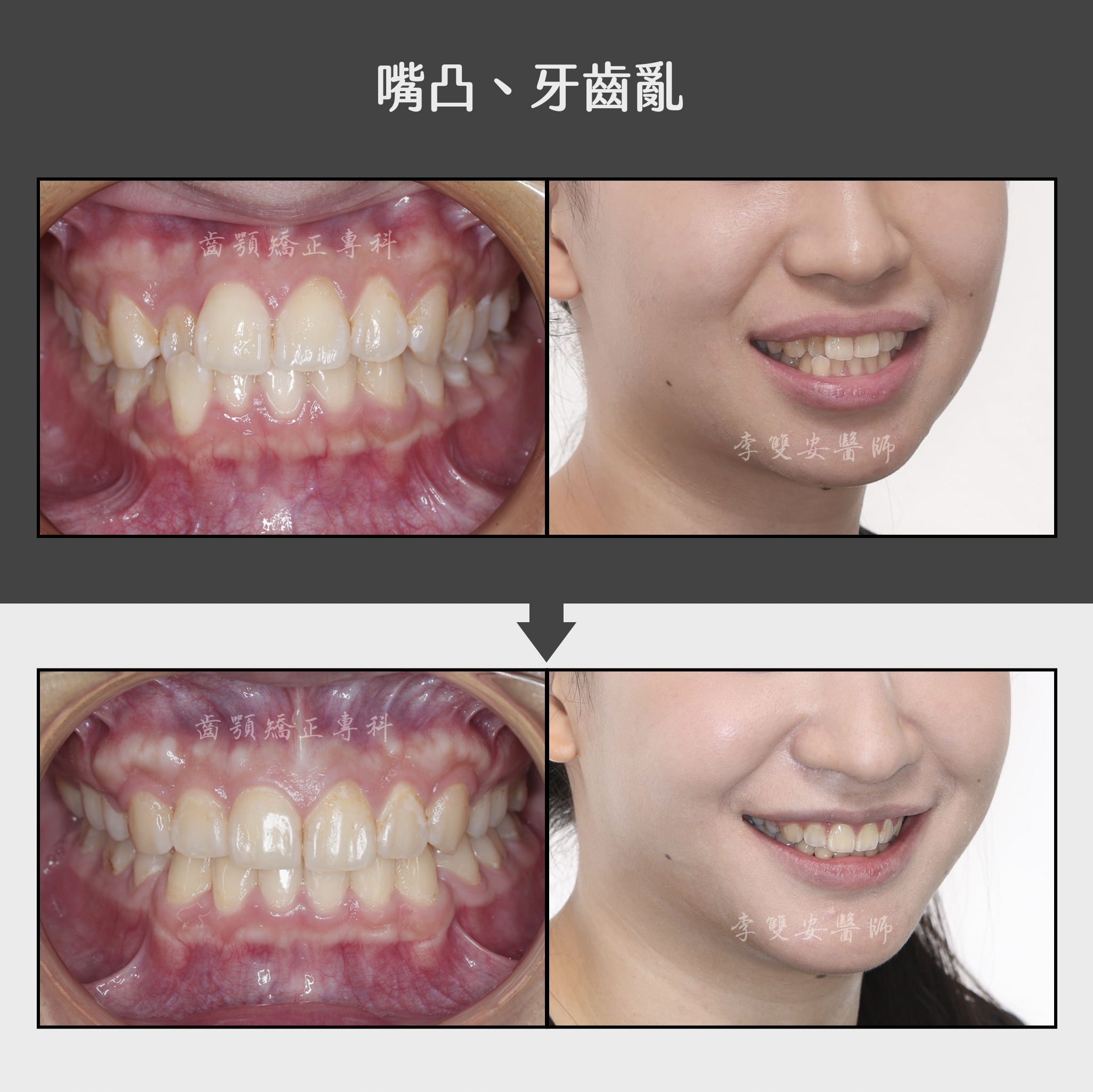 這位患者初次來到診間諮詢時,最在意的是「牙齒凌亂」以及外觀上「嘴凸」的問題。因為這些困擾,讓她在開口笑時總是少了一點自信。